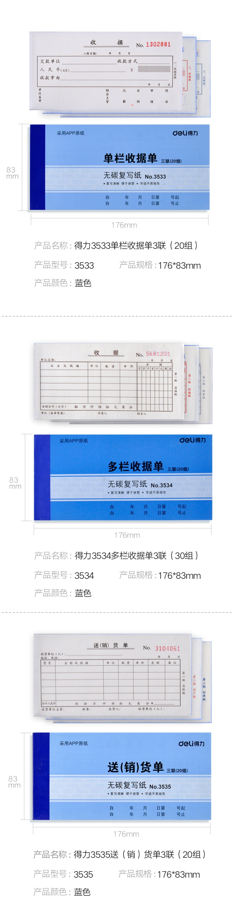 - 商品名称:得力(deli) 单据票据收据领料出库入库送销货单 无碳复写纸财务办公用品3535三联送(销)货单十本装