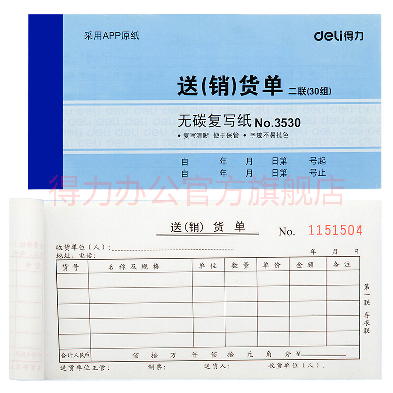 - 商品名称:得力(deli) 单据票据收据领料出库入库送销货单 无碳复写纸财务办公用品3533三联单栏收据单十本装