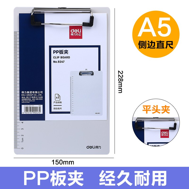 - 商品名称:得力A4学生用书写木板夹文件夹板a5写字垫夹垫板菜单夹子板夹资料册试卷夹纸夹板办公文具9242/透明蓝A5蝴蝶夹