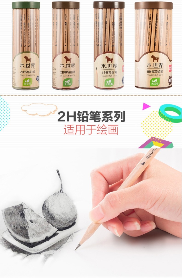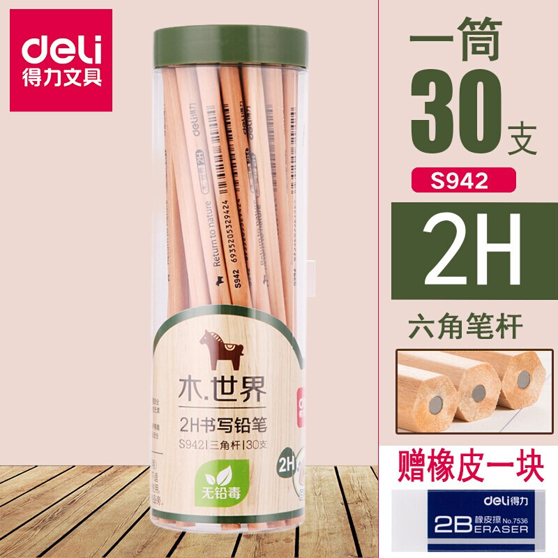 - 商品名称:得力(deli) 铅笔素描绘图学生原木铅笔 学生用品 30支/桶 2B三角木世界S944