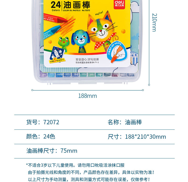 - 商品名称:得力(deli)24色学生三角杆丝滑油画棒儿童蜡笔绘画笔(内赠5张填色卡)72072