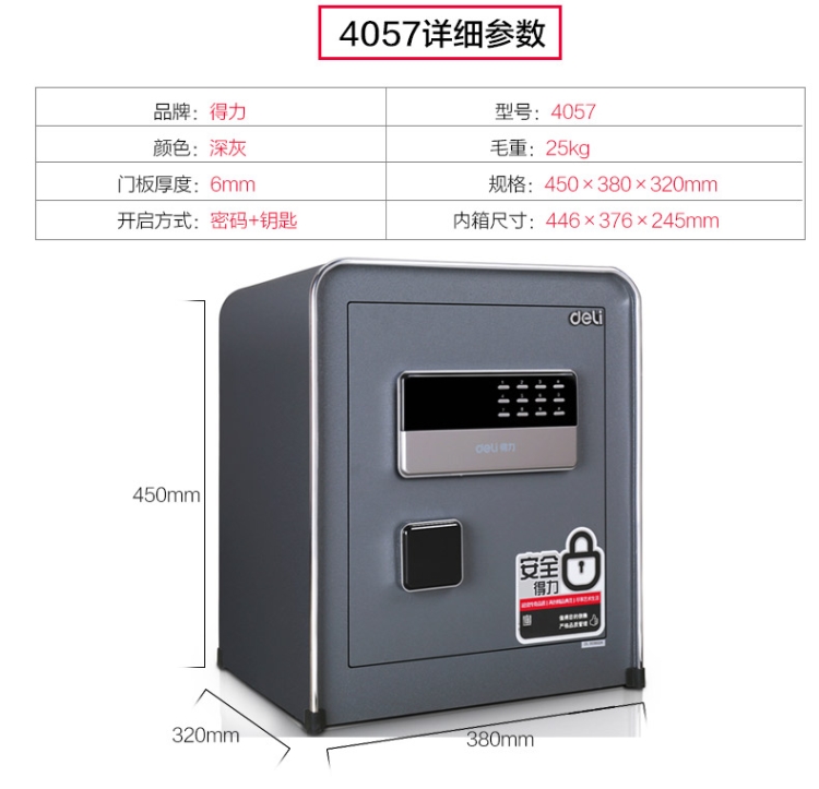 - 商品名称:得力(deli) 4060方便实用安全报警设计电子密码保管箱家用保险柜保险箱系列4058深灰色(高60*宽42*深36cm)