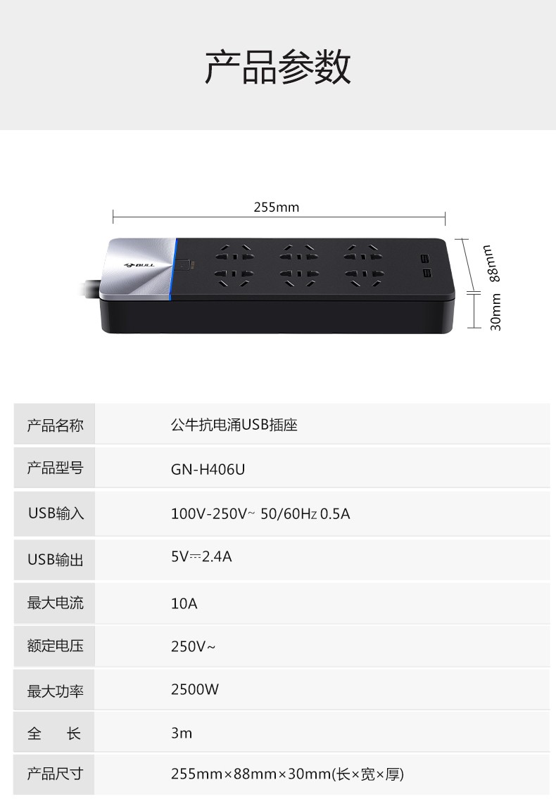 - 商品名称:公牛插座 H406U 抗电涌插板过载保护插线板 带儿童保护门 插排插板拖线板 转换器独立开关控制六位总控开关带USB全长3米