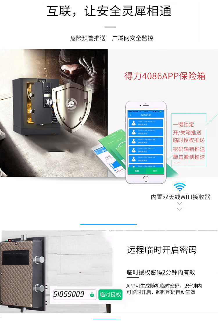 - 商品名称:得力(deli)家用办公保险柜 智能手机WIFI报警APP小保险箱82cm智能APP保险柜(4089)