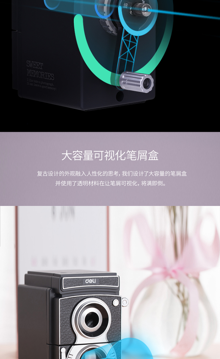 - 商品名称:得力(deli)0668复古相机造型转笔刀 卷笔刀铅笔刀 可调粗细学生手摇铅笔削笔器 削笔刀 黑色