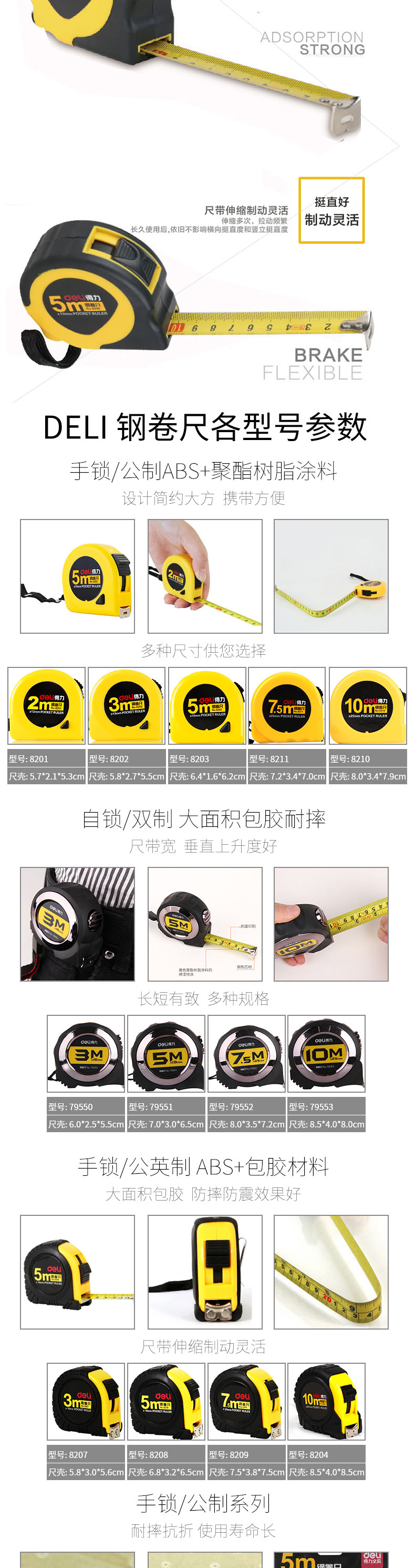 - 商品名称:得力(deli) 8201钢卷尺卷尺耐摔钢卷尺尺子拉尺卷尺精准测量便携尺子测量工具2米3米5米7.5米10米 便携自动钢卷尺2米