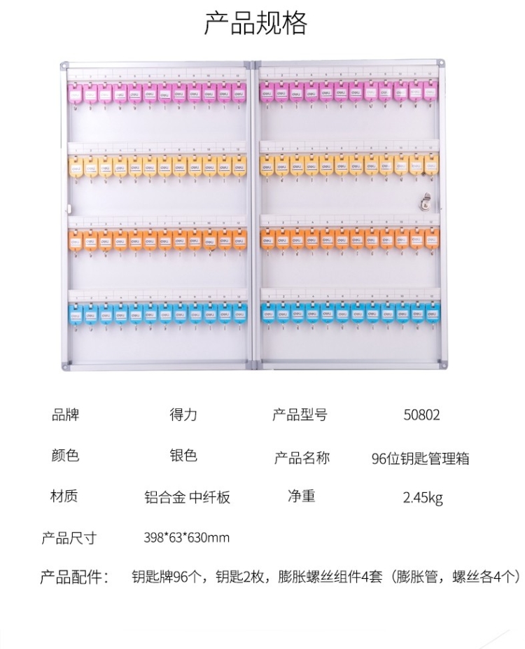 - 商品名称:得力(deli)金属钥匙管理箱管理柜 汽车钥匙柜壁挂子锁匙收纳盒办公用品标准款50802四排96位