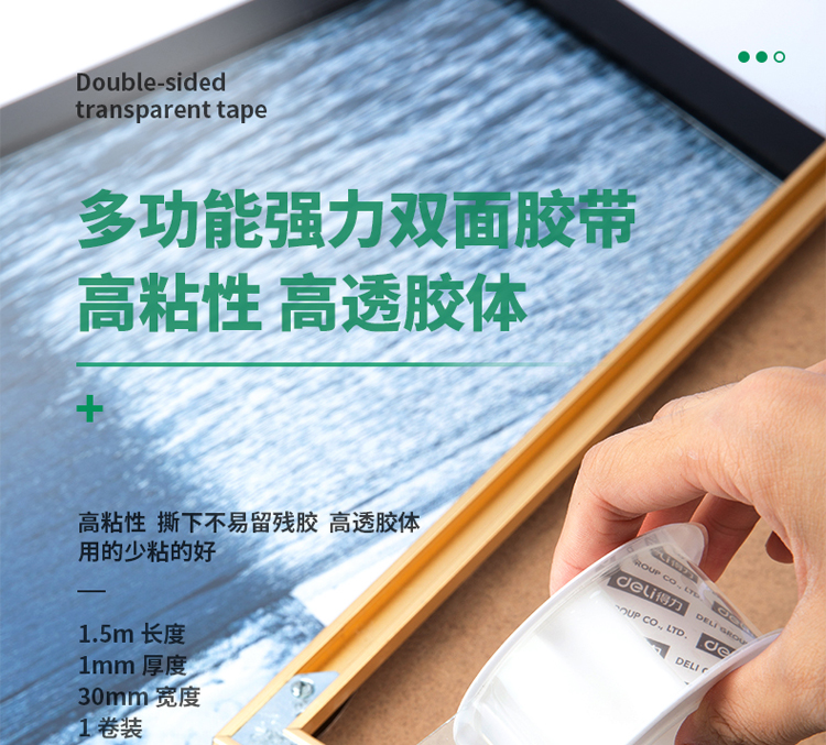 - 商品名称:得力33605 (deli)30mm*1.5m纳米强力无痕魔力胶带 随手贴 透明家用车用双面胶 可重复使用