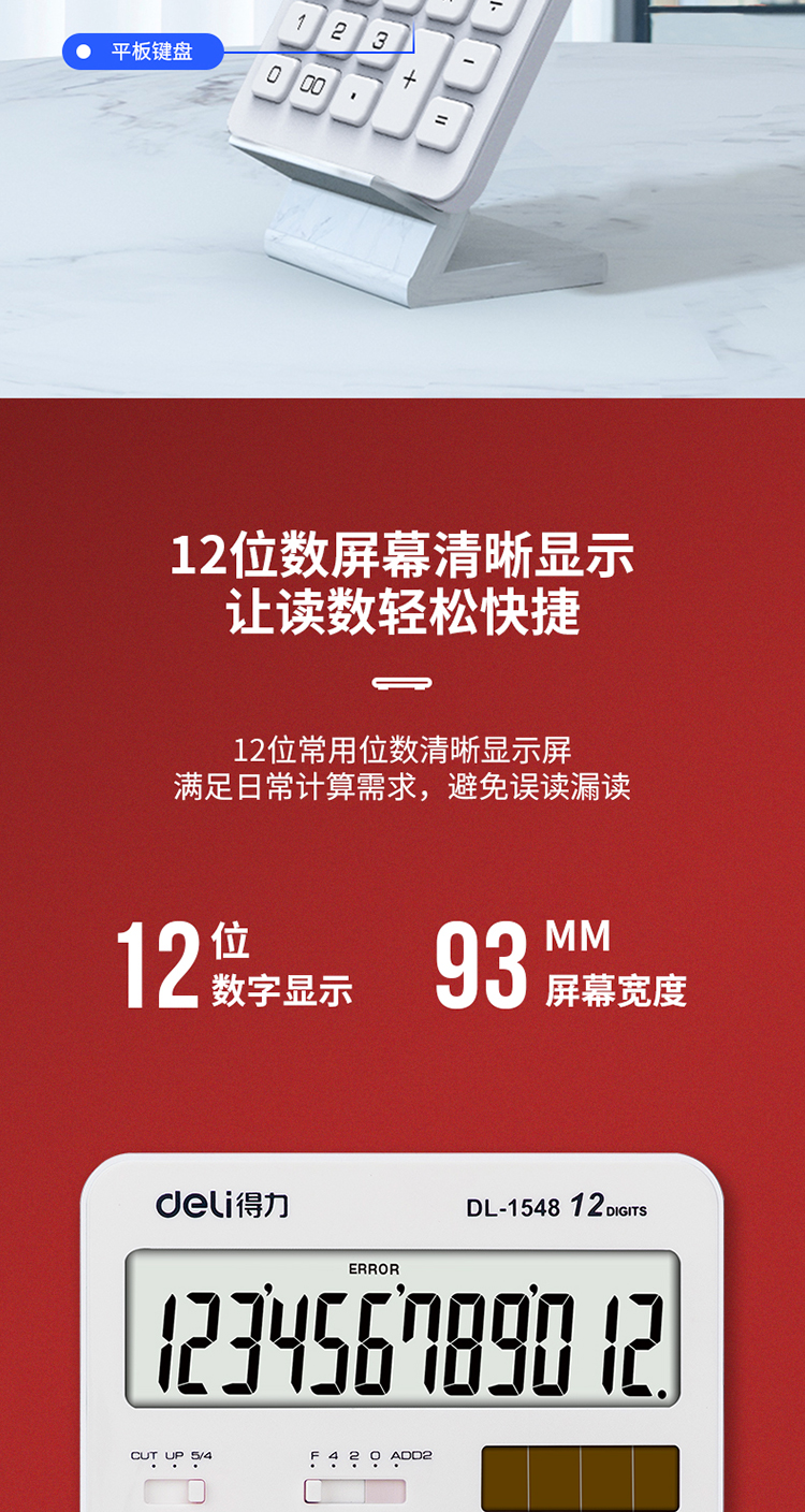 得力(deli)1548A双电源平板式计算器 12位大屏桌面计算机 白色