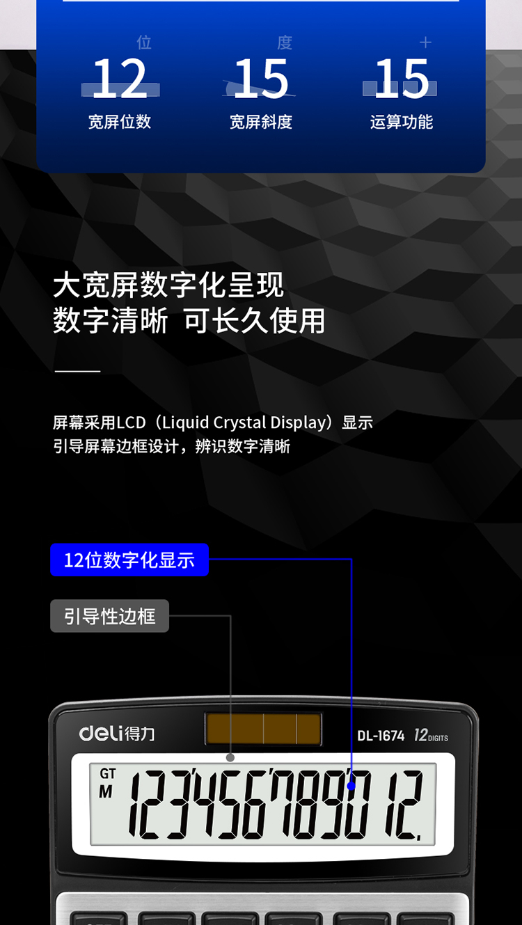 - 商品名称:得力(deli)计算器 837ES 桌面通用办公计算机 12位大屏幕 双电源 1675太阳能双电源黑色款