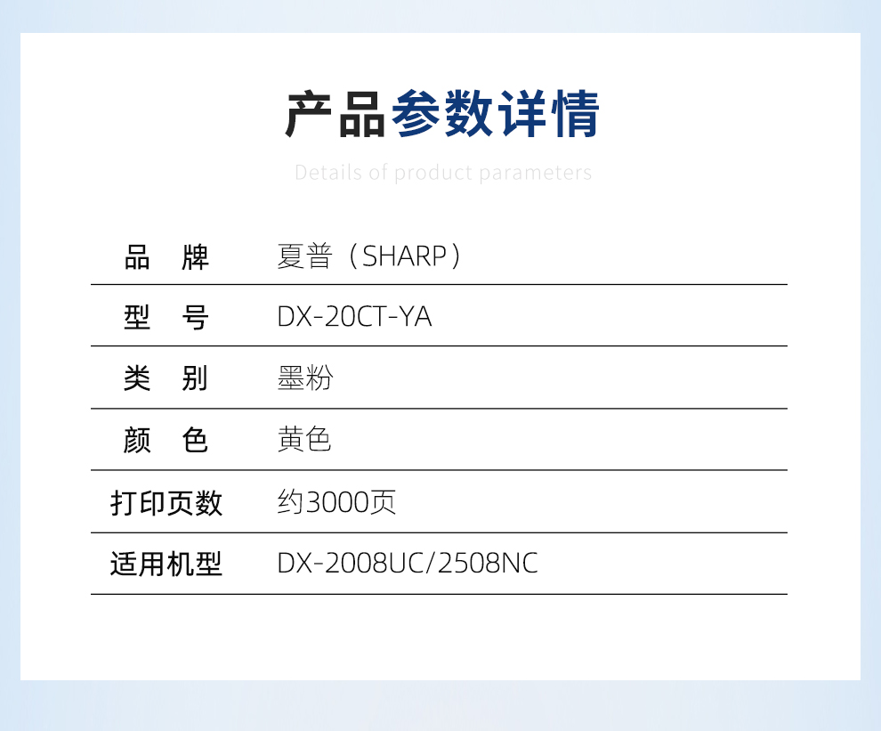 - 商品名称:夏普(SHARP) DX-20CT-YA 原装黄色墨粉 标准容量(适用DX-2008UC/2508NC机型)约3000页