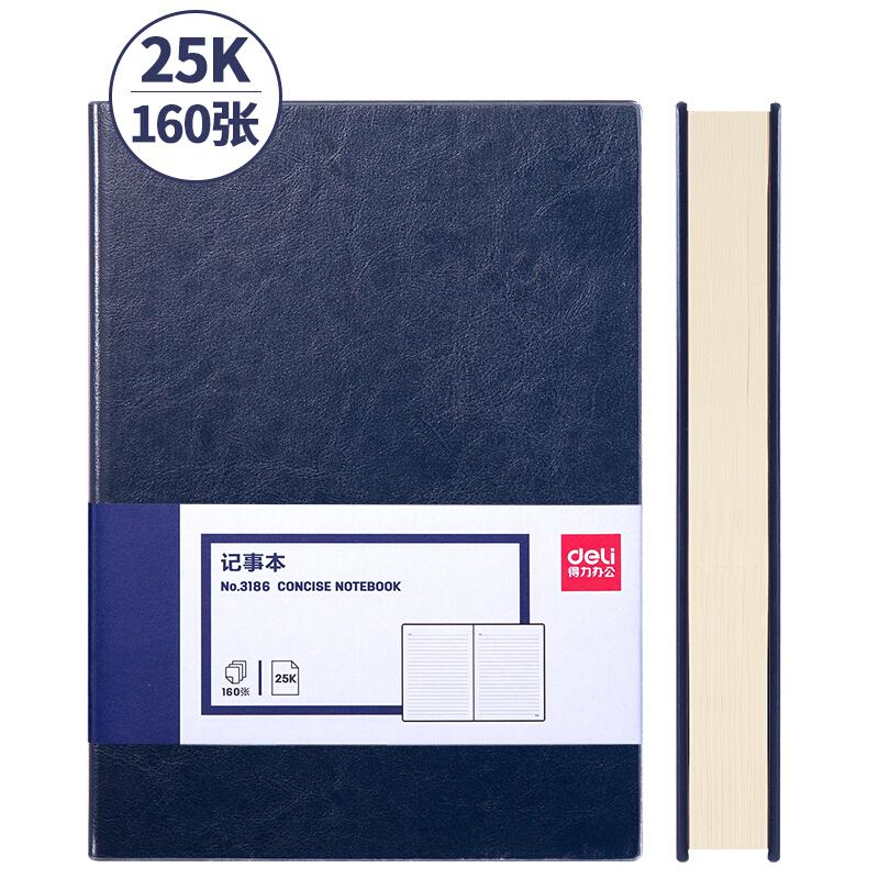 - 商品名称:得力(deli)25K160张加厚商务皮面本 办公会议记事本笔记本子文具蓝色3186
