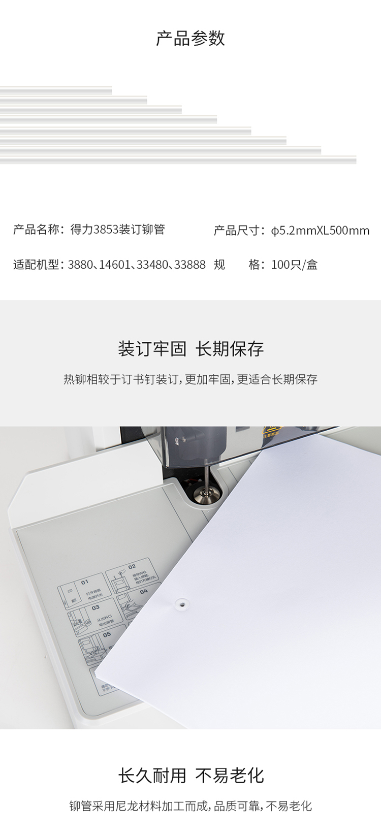 - 商品名称:得力(deli)3853 自动财务凭证装订机专用铆管500mm 100支/盒(适用于得力3880338881460133480)