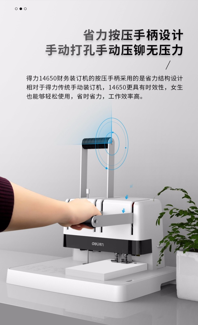- 商品名称:得力(deli)14650财务凭证装订机热熔铆管手动单据打孔机会计专用ABS大台板省力手动型可装钉30MM